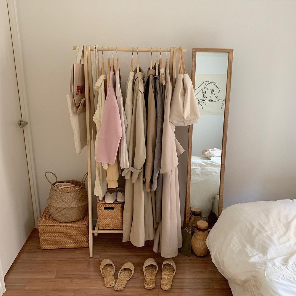 洋服の色合いなども揃えたルームコーディネートを。同じような色合いの洋服をこうしてラックにかけて見せる収納にすることで、まとまりよくお部屋の世界観が確立されますね。