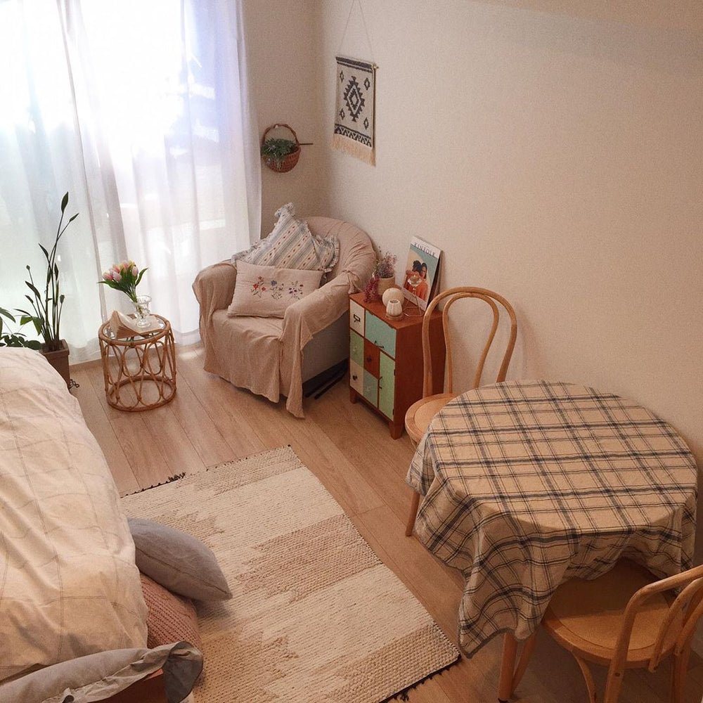 お部屋が落ち着いたベージュでまとめられているおかげで、一見ガーリーなアイテムでも甘くなりすぎないんです。