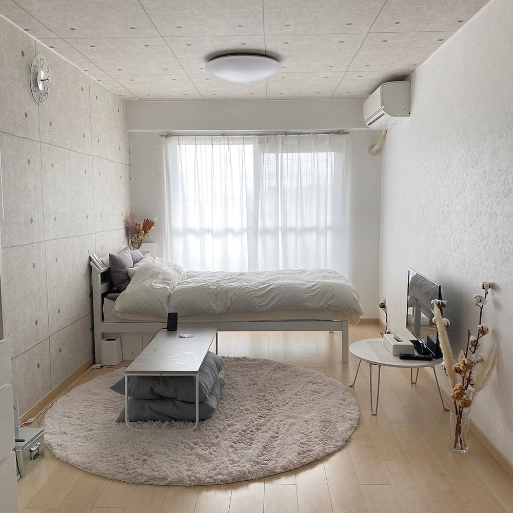 ベッドリネンやラグ、カーテンなど、ファブリックは全て同じトーンのものを選んでまとまりのあるすっきりとしたお部屋に仕上げる。