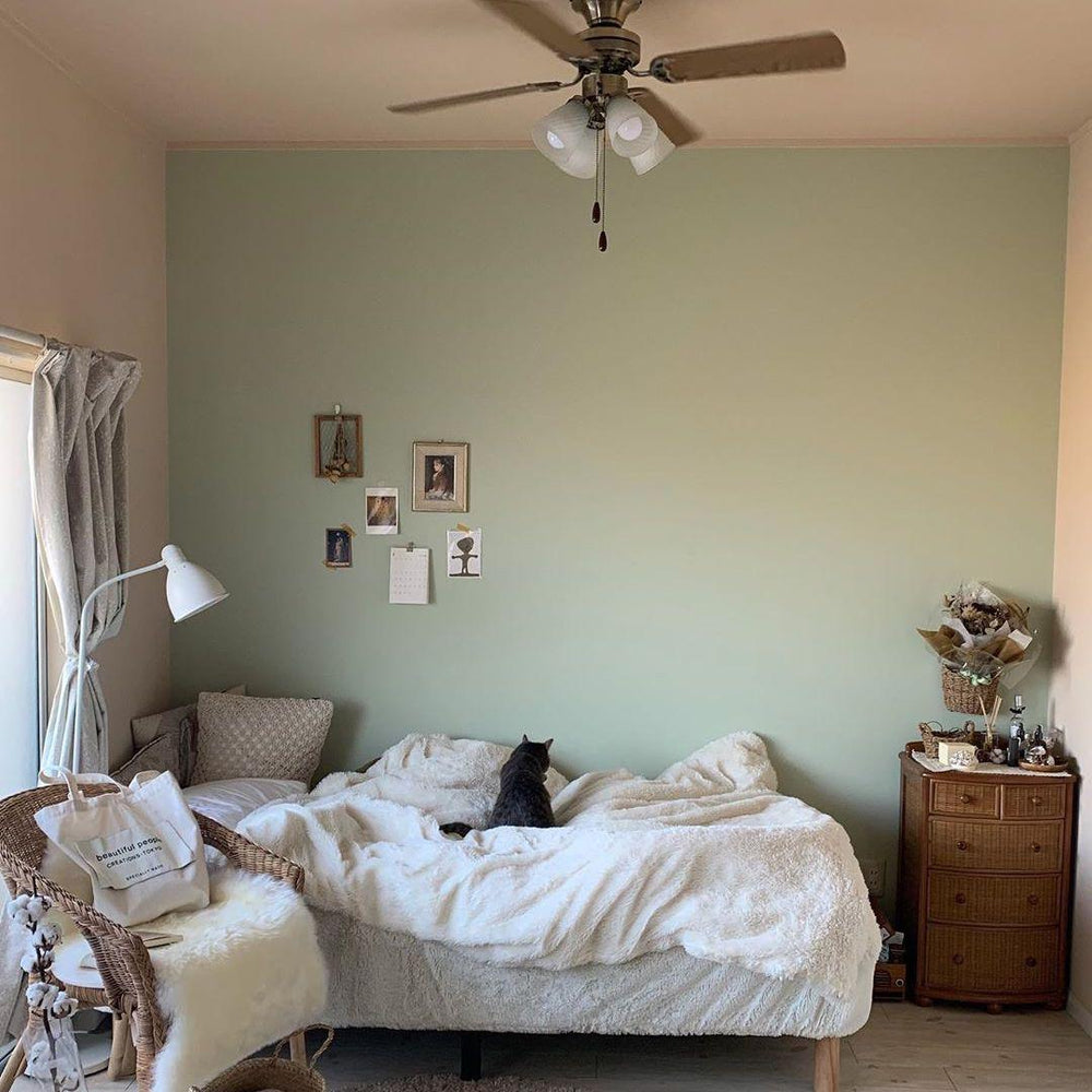 パステルグリーンカラーとカーテン越しの日光が相まって、開放的で明るいお部屋に。