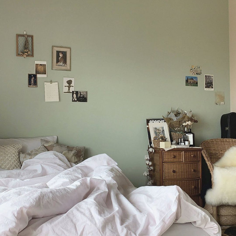 爽やかなミントグリーンと、ナチュラルなラタンチェストの組み合わせは相性抜群◎
