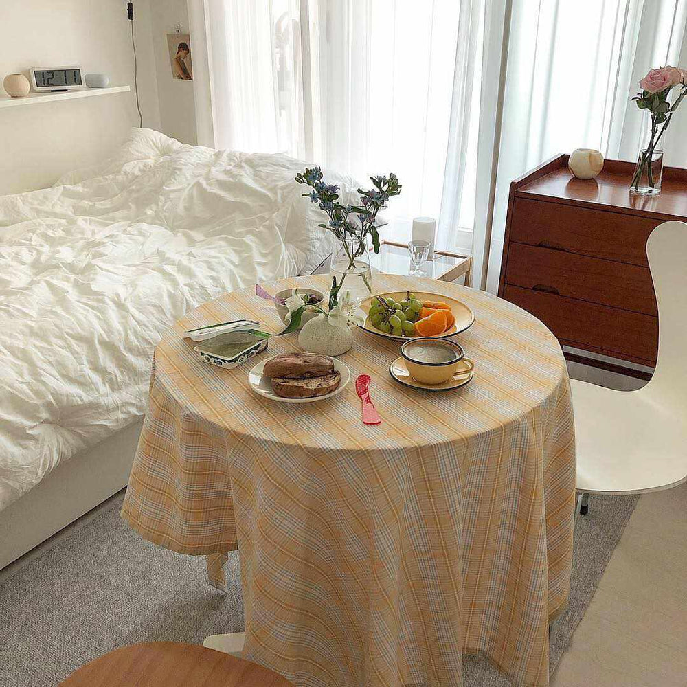 イエロー×ギンガムチェックのテーブルクロスは、お部屋をパッと明るく見せてくれるので、カフェメニューがもっと華やかに。
