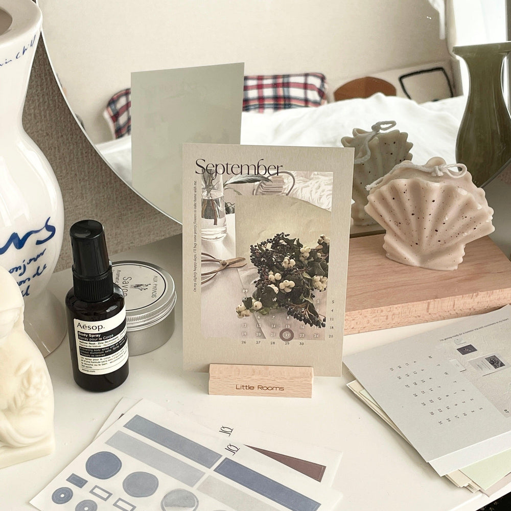 カレンダーと一緒にお届けする、こちらのウッドスタンドは、淡い色味の木材を使っているので、お部屋に取り入れやすい。