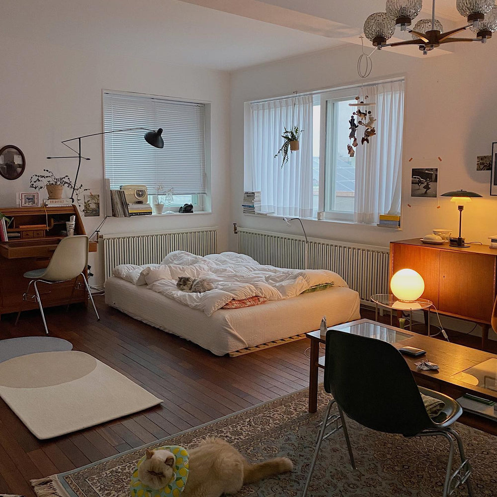 ベッド横には、空間を仕切ってくれる小さめサイズのラグがおすすめです。
