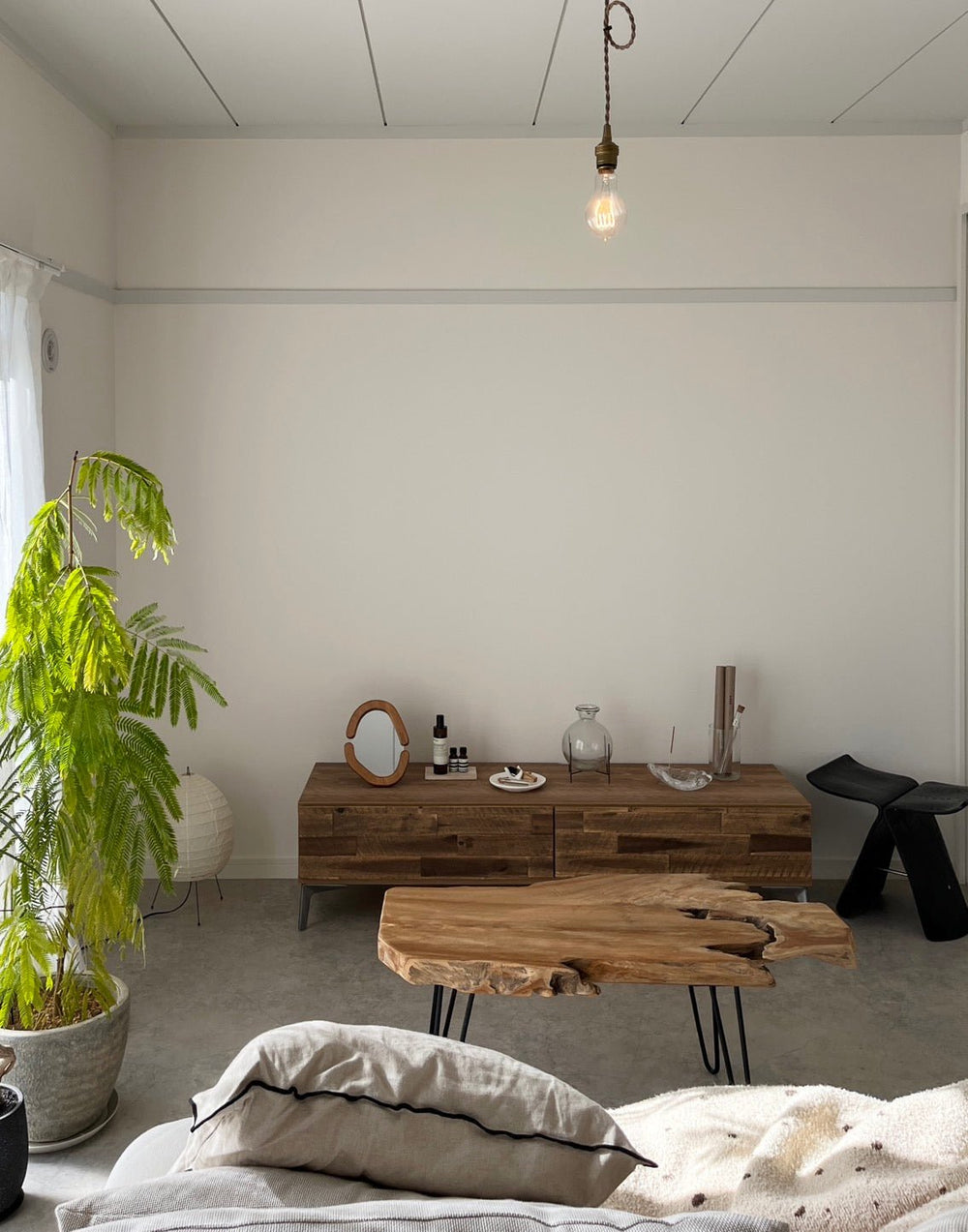 kabuさんお気に入りのantryのコーヒーテーブル。無垢な木のローテーブルが一気におしゃれ空間にしてくれています。いつ見ても素敵だな〜とうっとりしてしまうアイテムなんだそう。