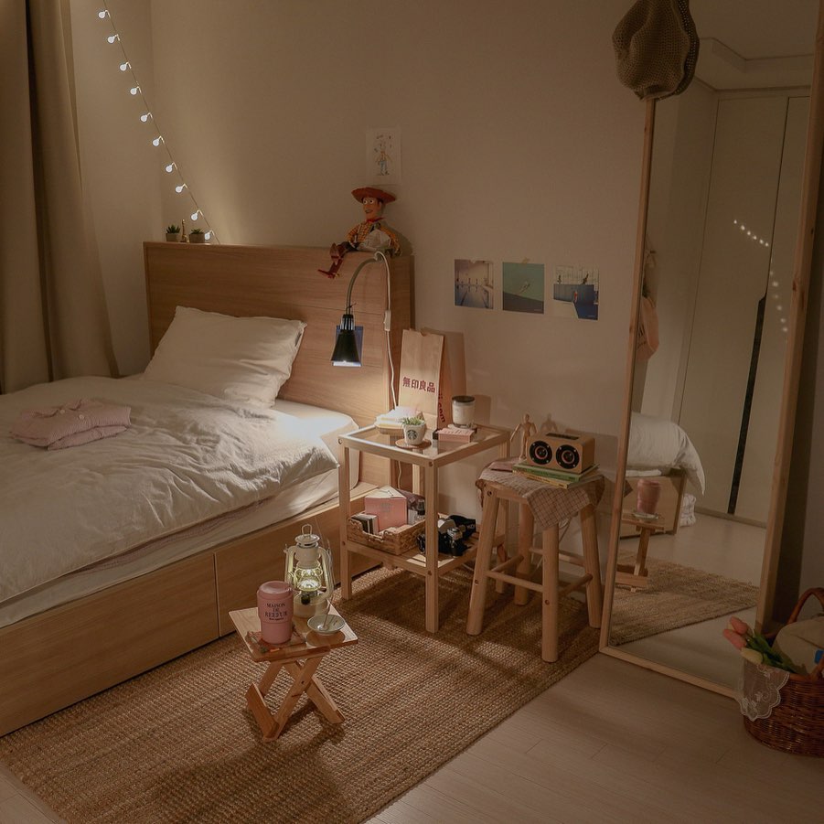 ベッドからサイドテーブル、鏡まで全て木製でそろえてしまうのも良いですね。
