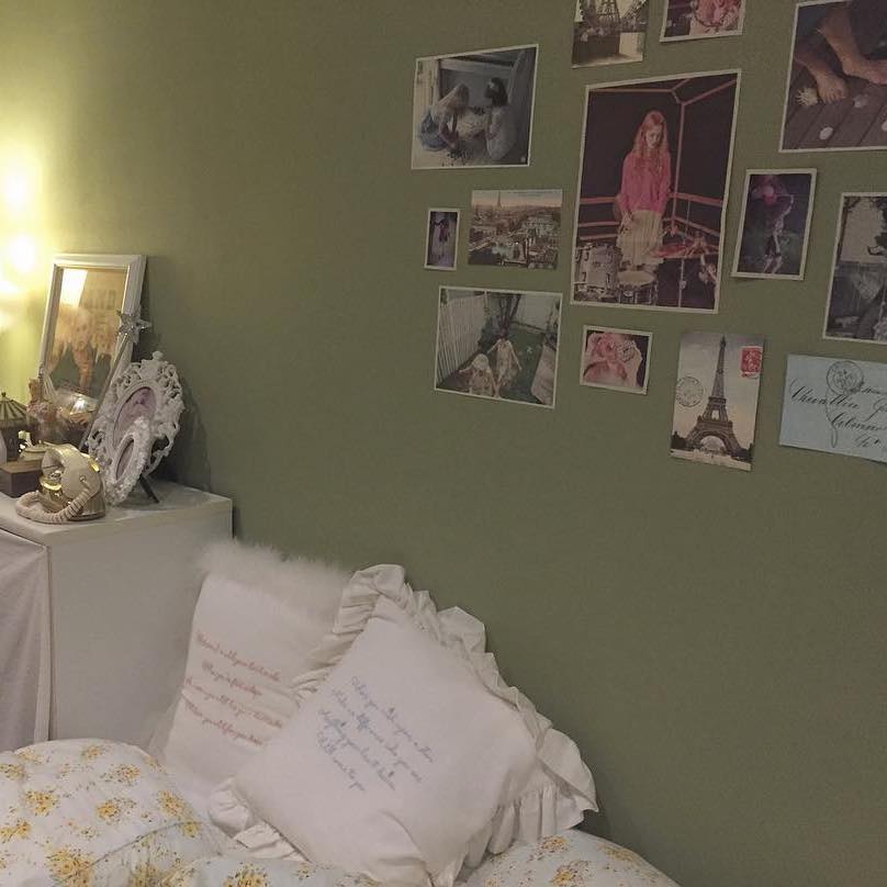 フリルクッションや、壁に貼られたポストカードがヴンテージガーリーなお部屋に仕上げてくれますね!