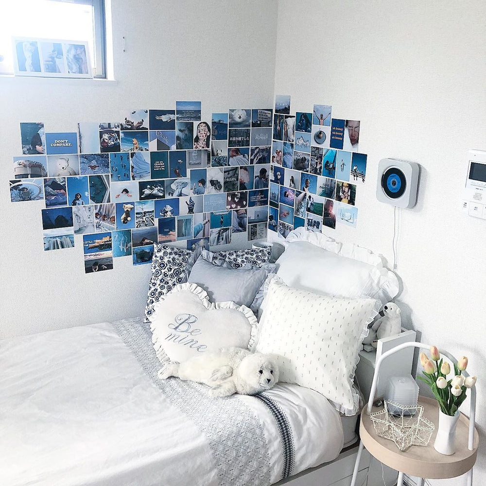 お部屋の一角に敷き詰められた、ブルーを基調とした写真や、自分で撮った写真や旅先で買ったポストカードなど青でまとめて一気に青春を感じられるお部屋に。爽やかな夏の思い出と一緒に夢を見よう。