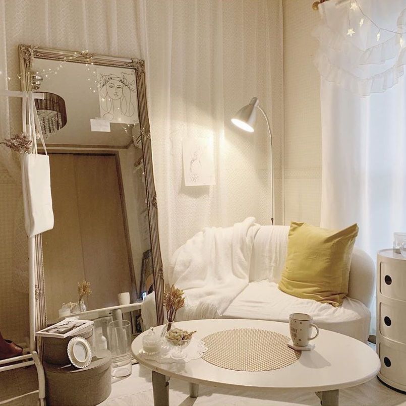 どーんっと置かれた大きなミラーは、おしゃれなだけでなくお部屋を広く見せてくれる効果もある優秀アイテム。