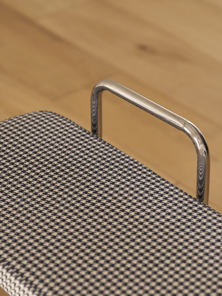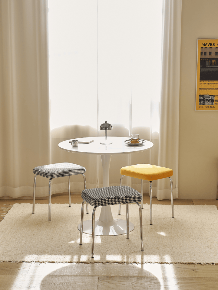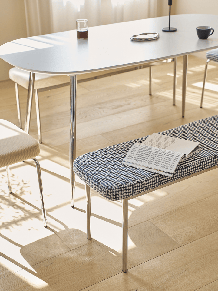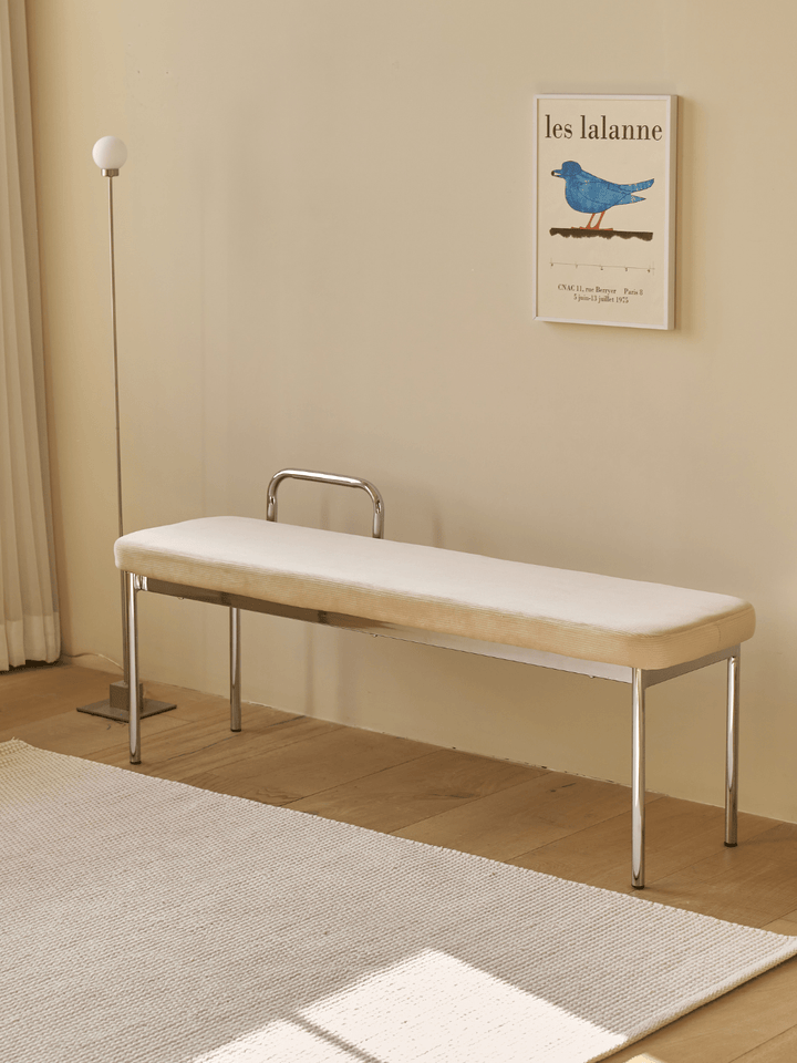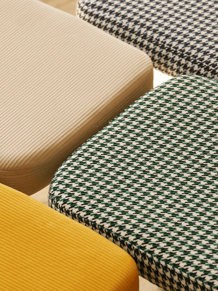 ふんわりとしたファブリック素材とモダンなスチールの組み合わせで、シンプルながらユニークなデザインのスツールとベンチです。