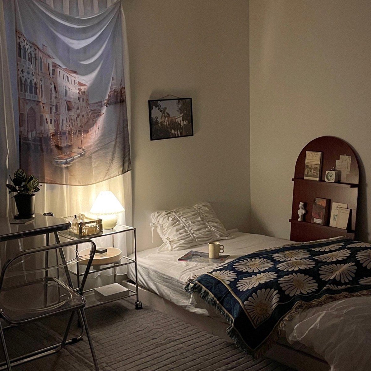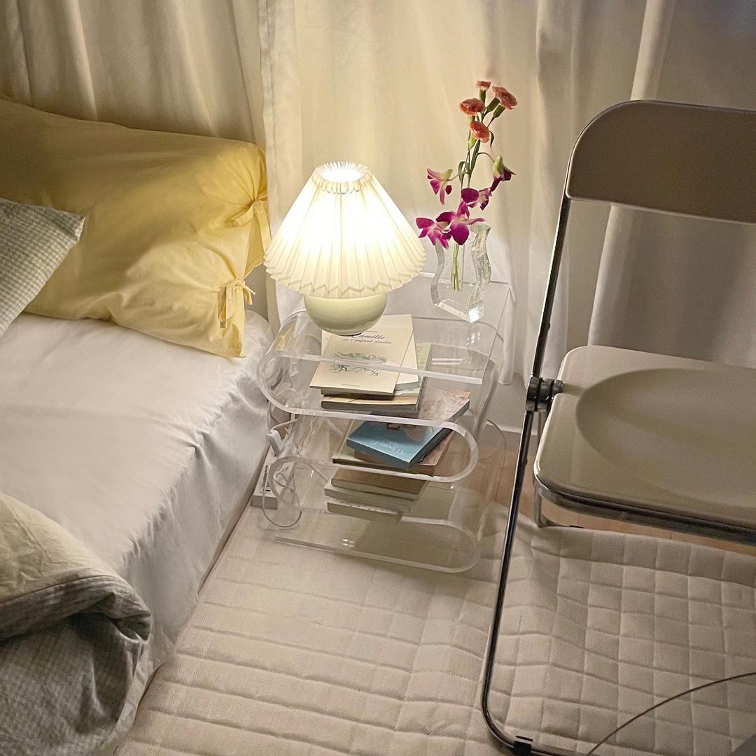 傘部分のプリーツと、ころんとした台座がかわいらしいランプ。韓国のお部屋でよく見るラウンド×シェードの組み合わせは、お部屋に遊び心をプラスしてくれます。