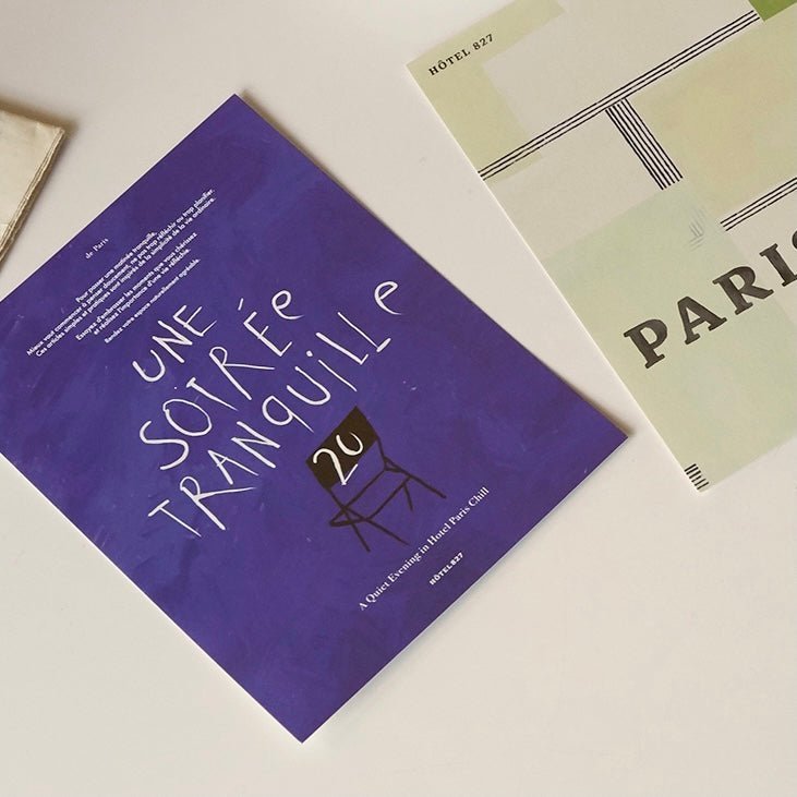 韓国ブランド『HOTEL PARIS CHILL』のポストカード、「A Quiet Night 」。深みのあるブルーを基調としたデザインで、静かな居心地の良い夜をイメージさせる一枚です。