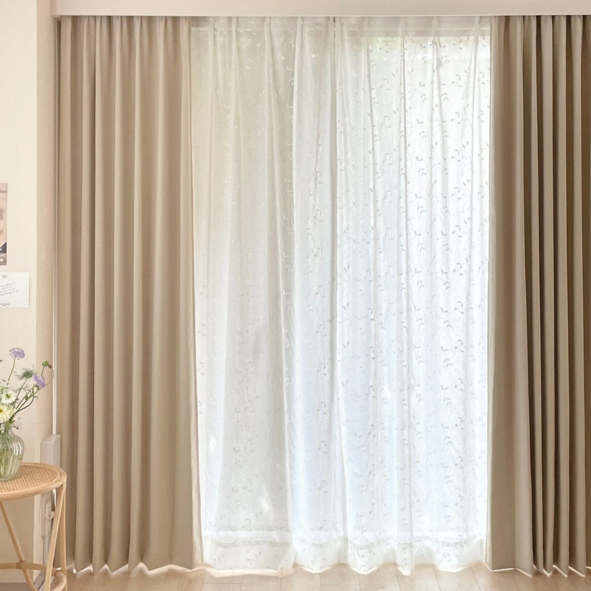 無地のカーテンと組み合わせれば、間からちらりと覗く刺繍がおしゃれシンプルながらもさりげないアクセントに。1級遮光のドレープカーテンなら、1人暮らしのお部屋や寝室など外からの光をシャットアウトしたい場所にぴったりです。