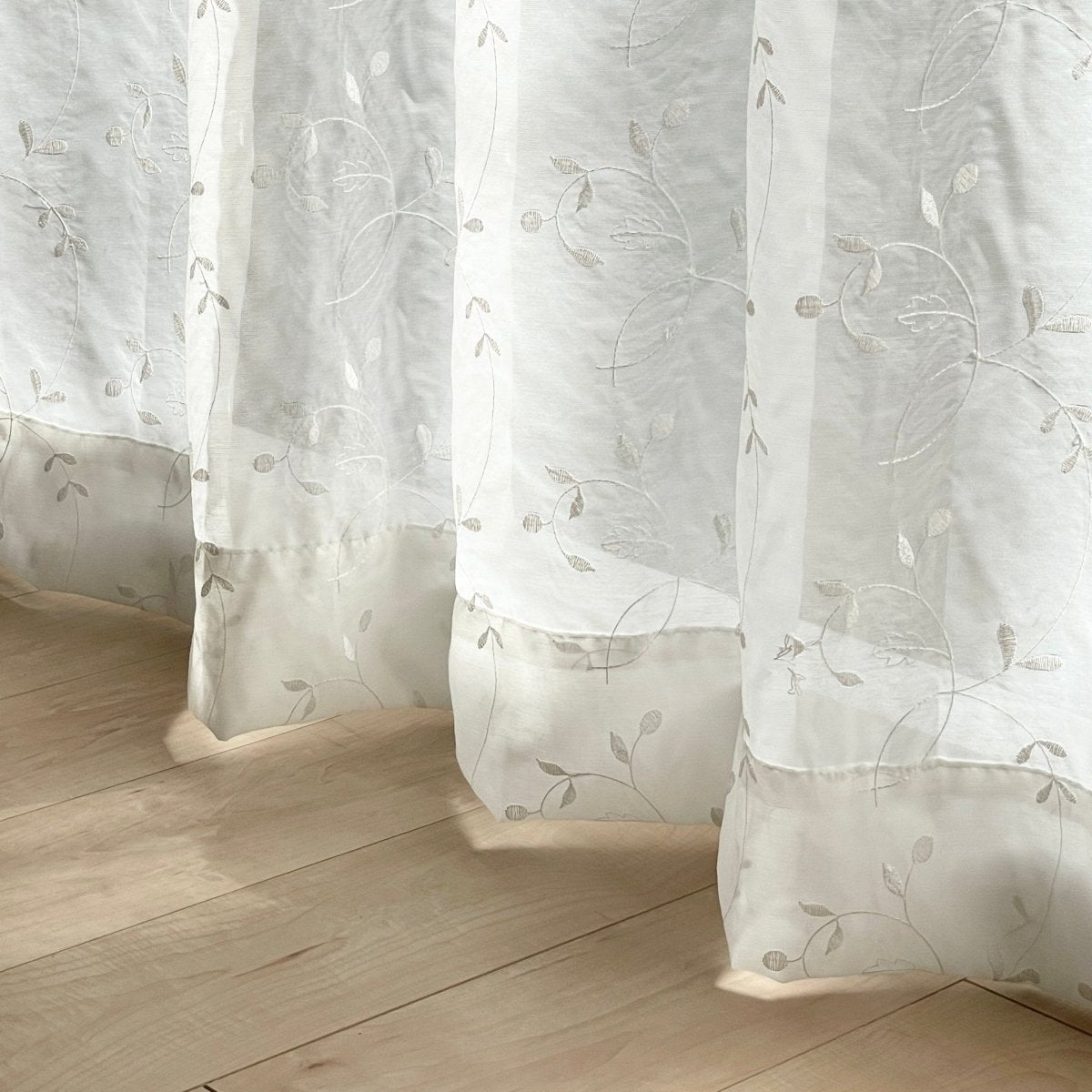 無地のドレープカーテンから刺繍をちらりと覗かせて