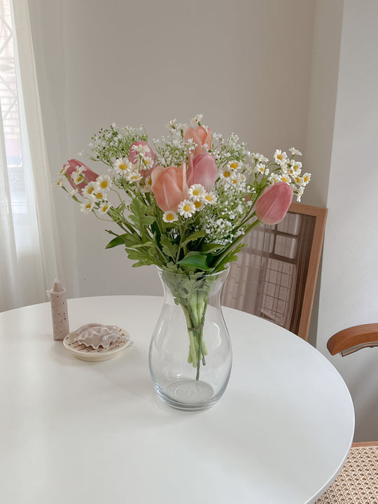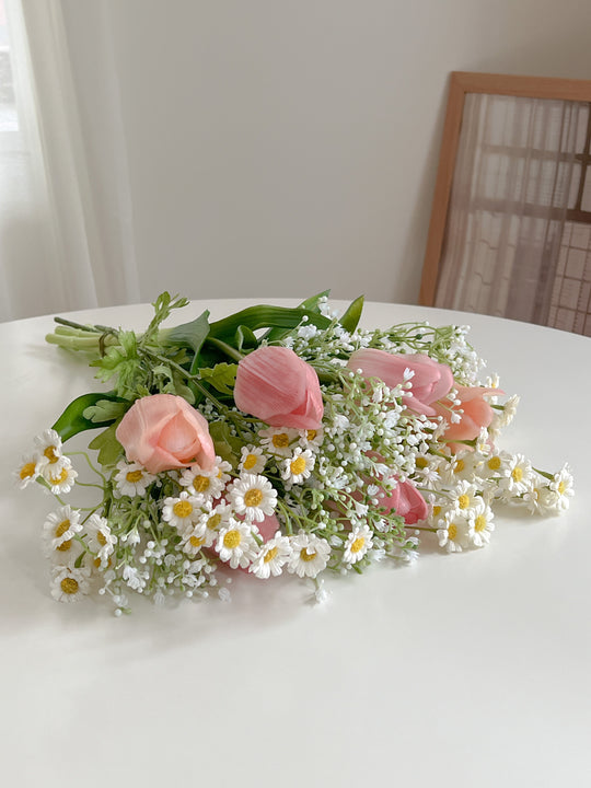 「love」は、淡いピンクのチューリップにカモミールの花を合わせた、甘くて爽やかな雰囲気のブーケです。