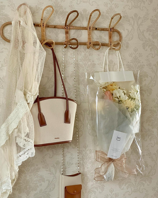「ラッピングあり」「花瓶セット」の2種類は、柔らかなペーパーとリボンでラッピングし、手渡しに便利なバッグに入れてお届けします。