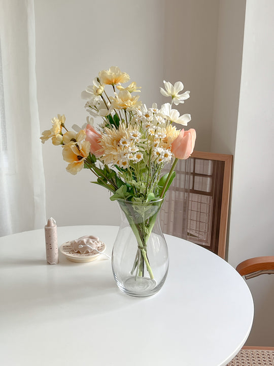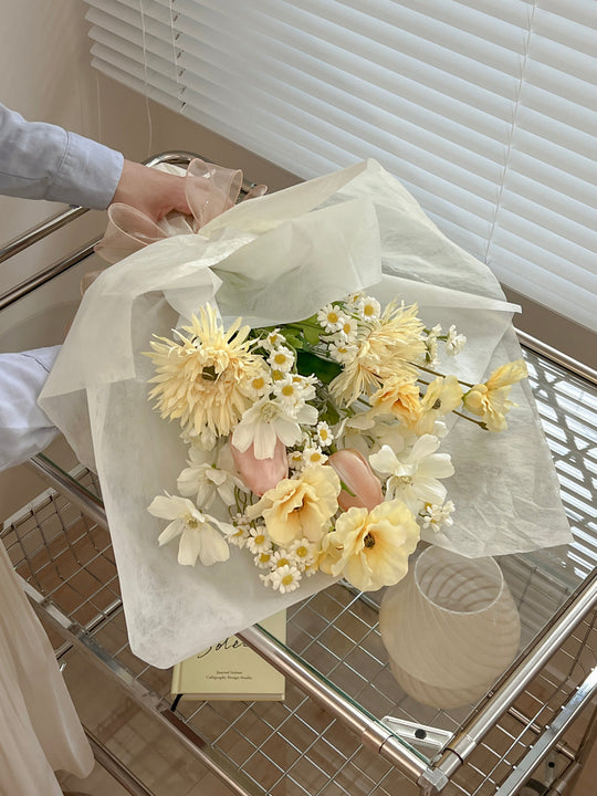 ボリュームたっぷりのブーケは、そのまま飾るだけでお部屋が華やかな印象に。優しい色合いのお花がふとした瞬間に疲れた心を癒してくれます。