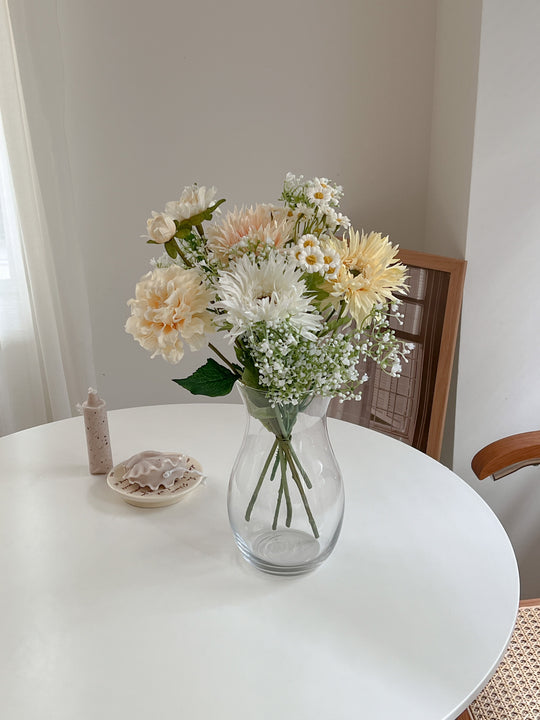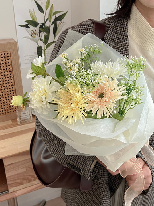 ボリュームたっぷりのブーケは、そのまま飾るだけでお部屋が華やかな印象に。優しい色合いのお花がふとした瞬間に疲れた心を癒してくれます。