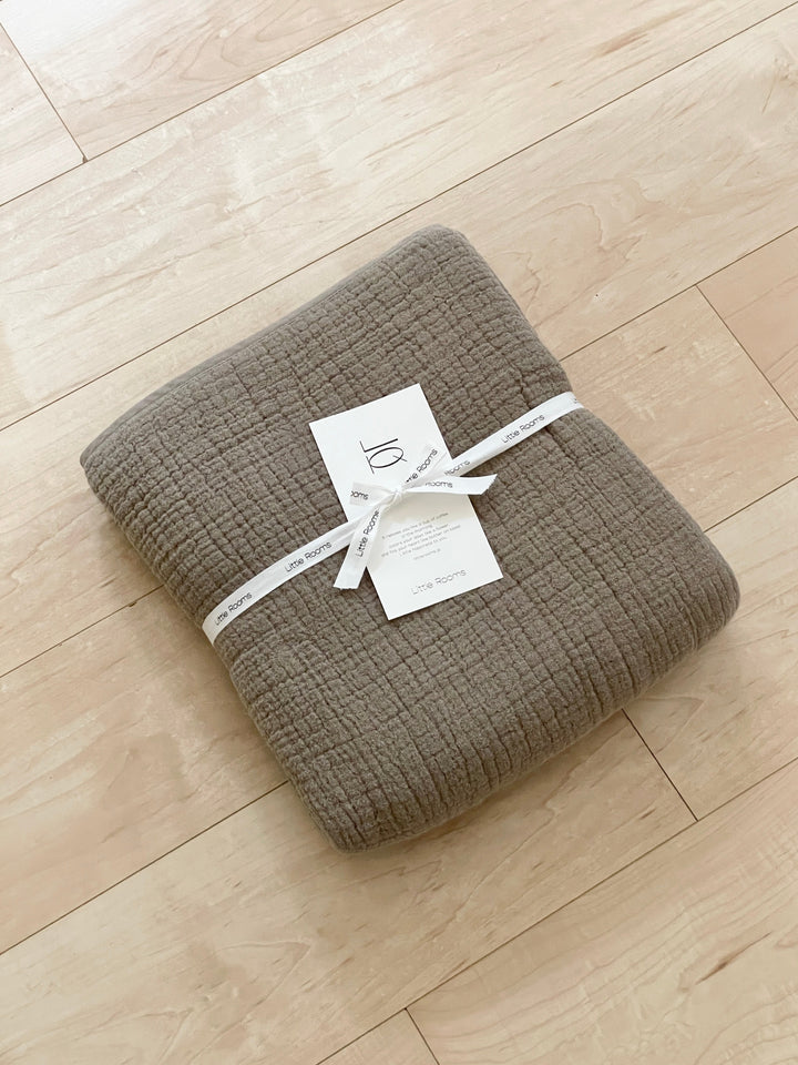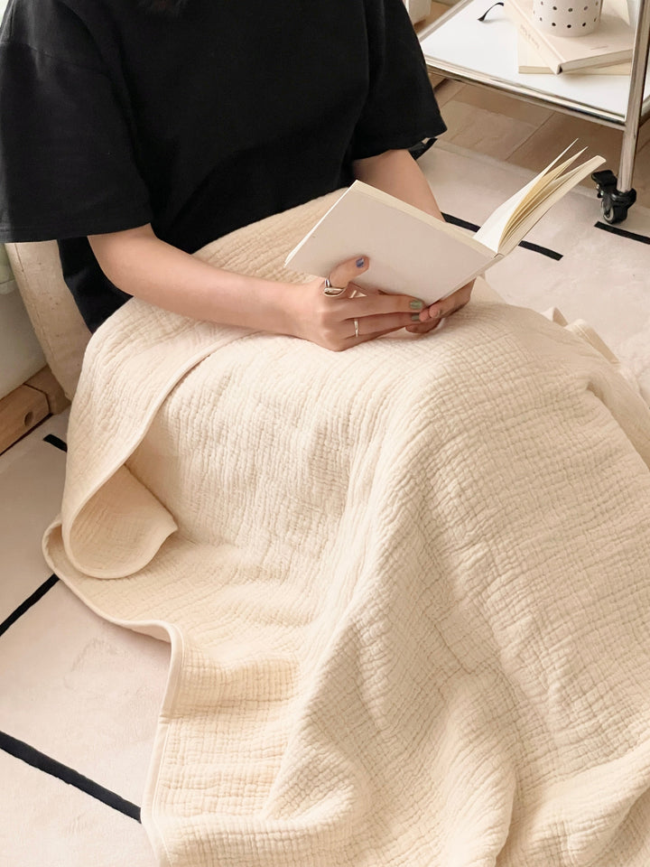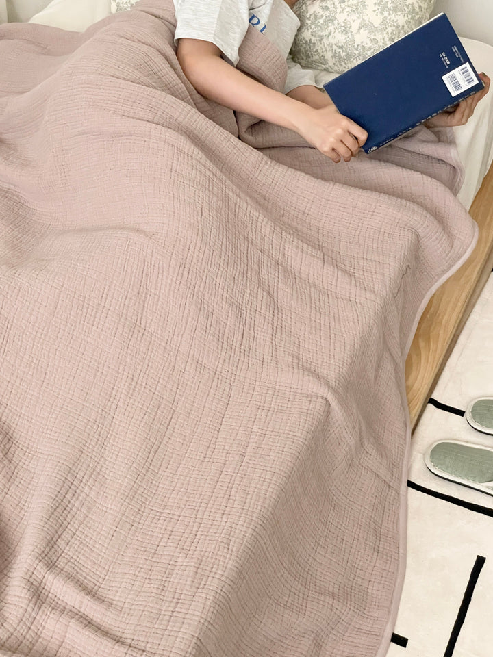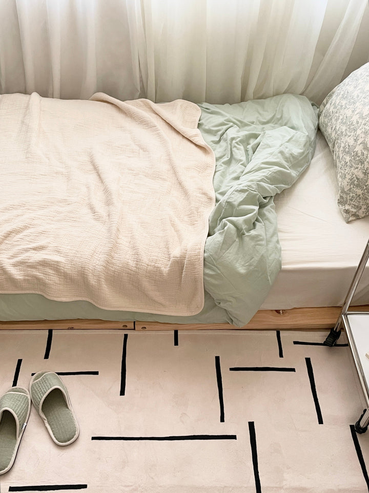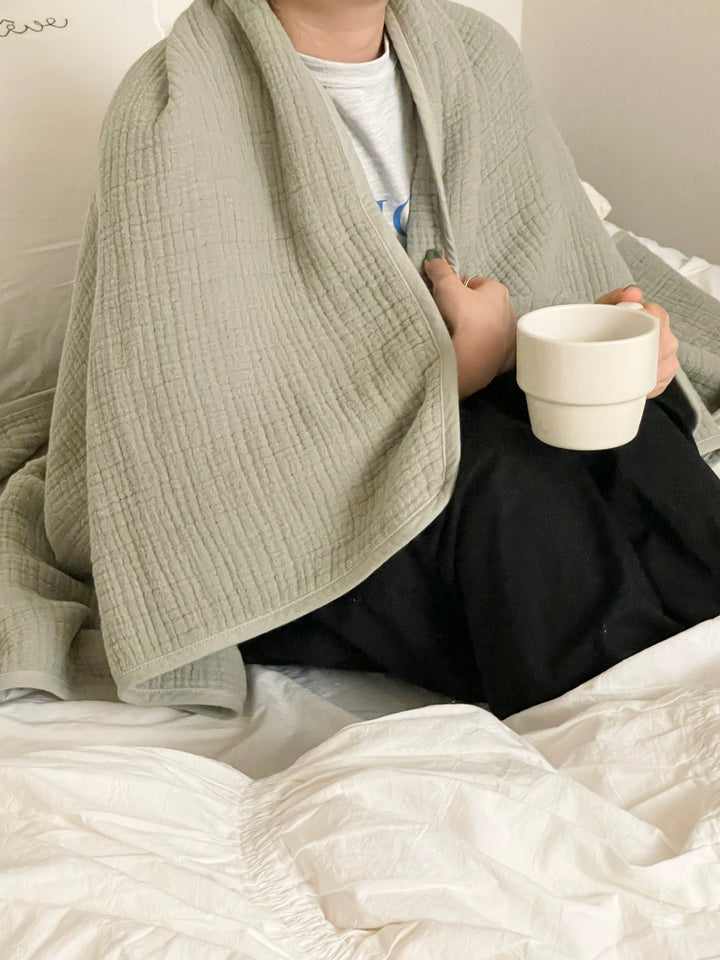 ガーゼケットは薄手で軽いので、布団の上にかけてベッドスローとして使うのもおすすめ。