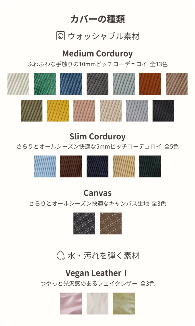 ・カバーは布製品のため、洗濯すると伸び縮みしてソファにサイズが合わなくなる可能性が少なからずございます。頻繁に洗濯することはできるだけ避け、日常的なお手入れはコロコロや部分手洗いをおすすめします。