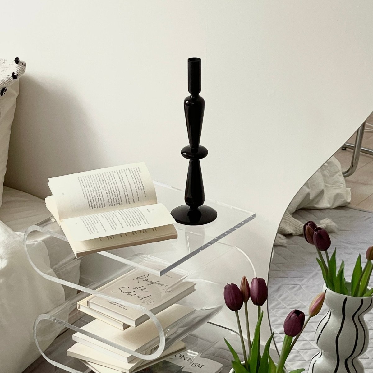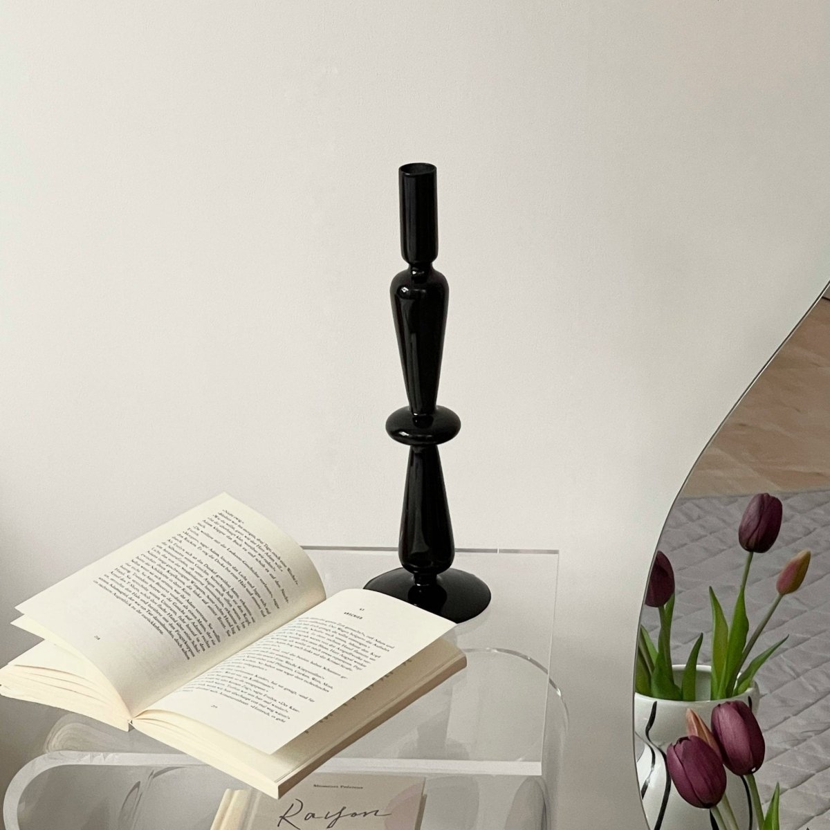 黒いガラスでできたキャンドルスタンド。ワンポイントでお部屋に飾れば、洗練されたおしゃれなムードを演出してくれます。