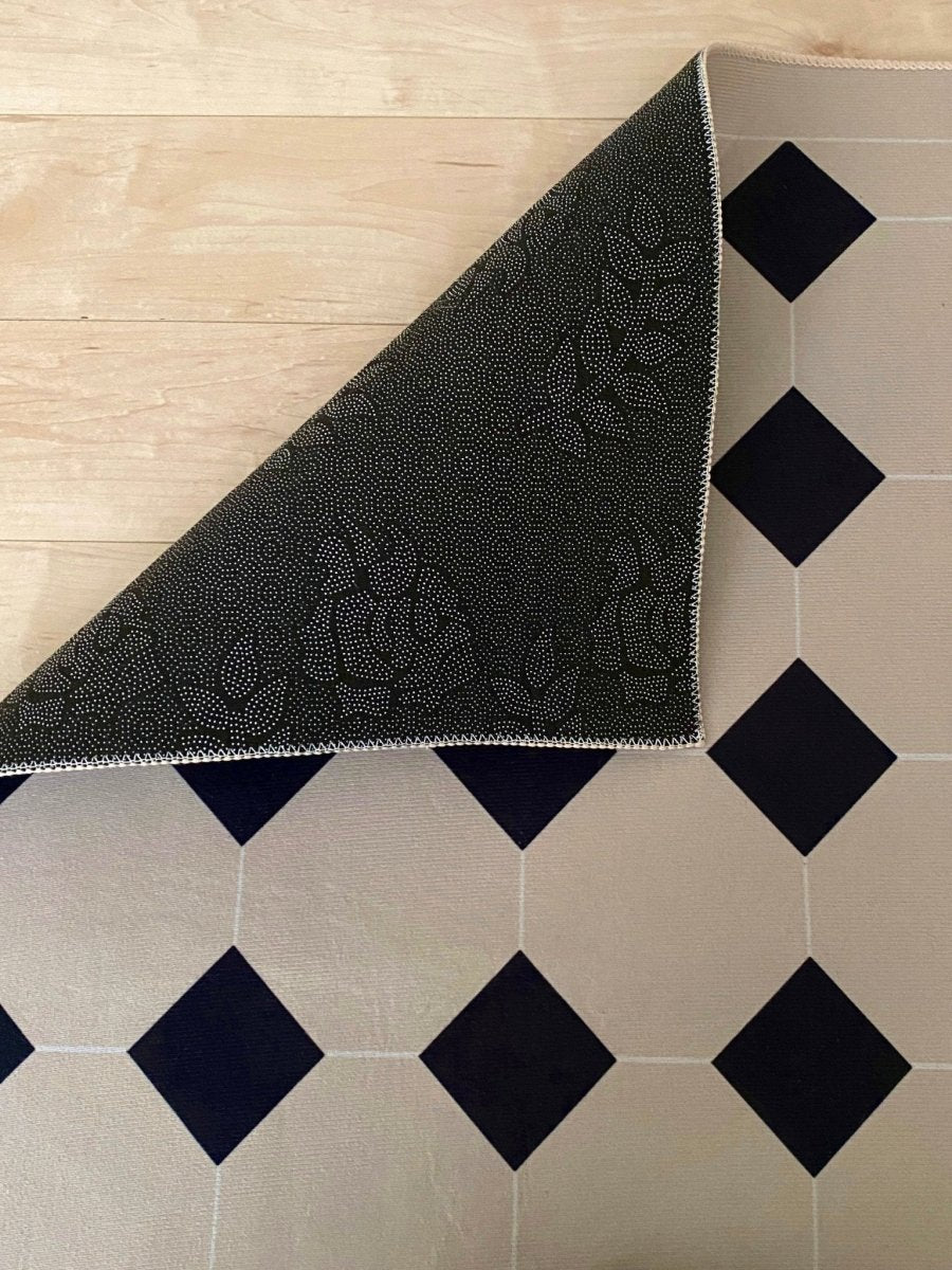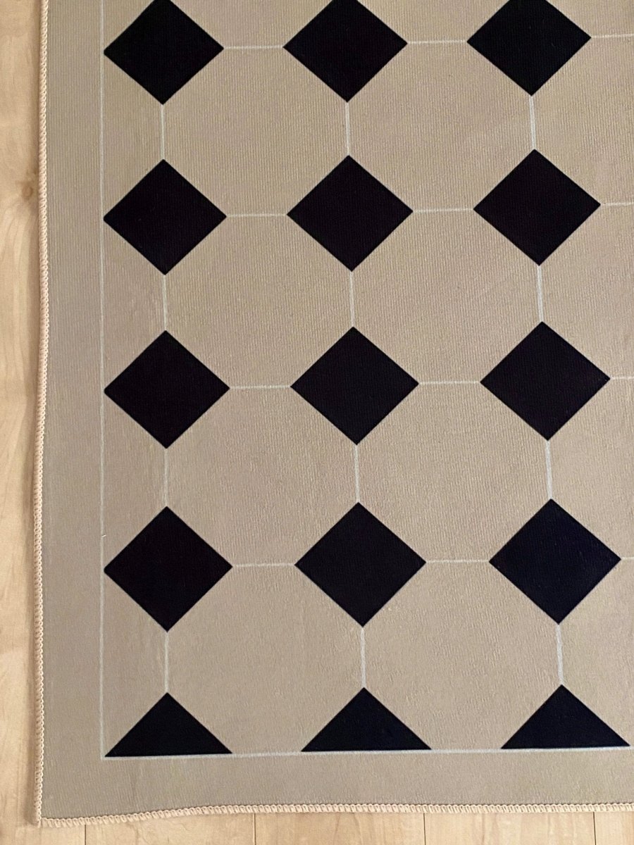 デザインが目を引くトレンド感あるラグは、ベースカラーが馴染みの良いベージュなので床と調和して、統一感あるインテリアを叶えてくれます。表面はすべすべとしていて肌触りも◎裏には滑り止め付き。薄くてコンパクトにしまっておけるところも嬉しいポイント。