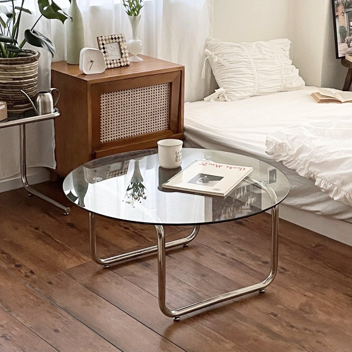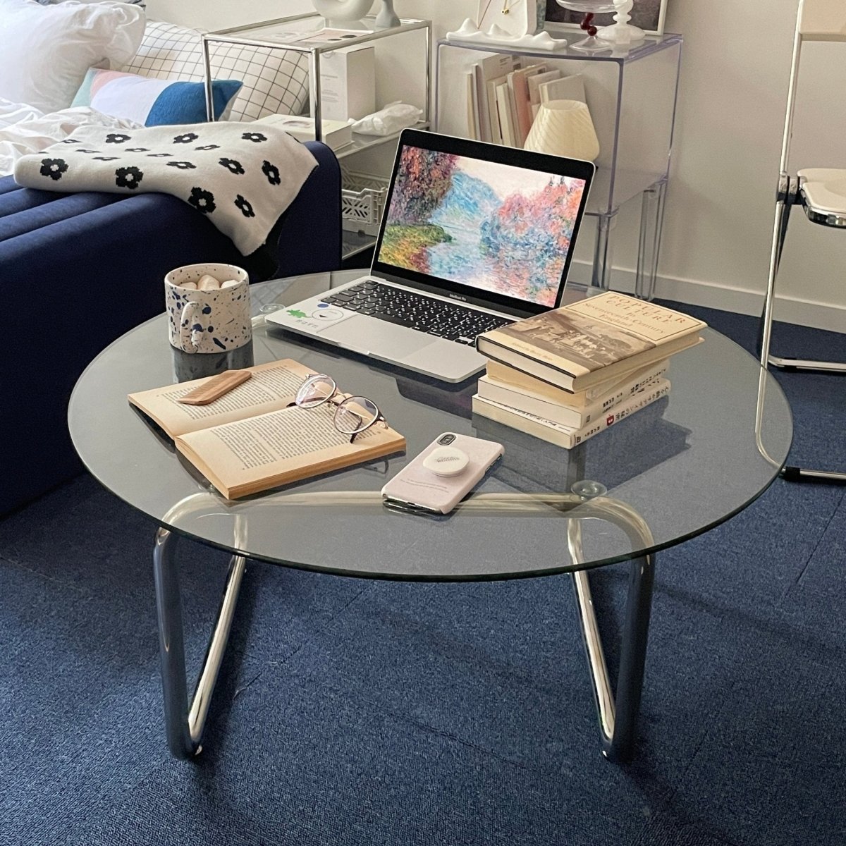 丸い形のクリアガラスとスチールの脚を組み合わせたローテーブル。