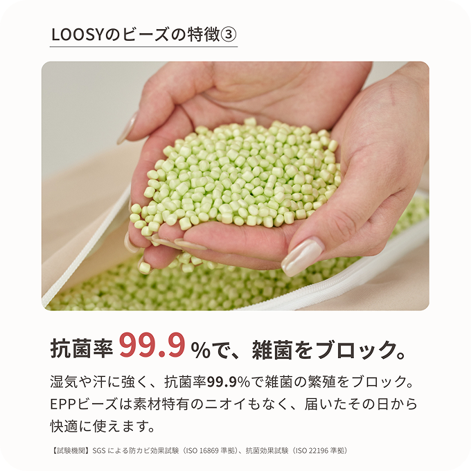 LOOSYは、へたりにくさにもこだわった素材を採用しており、さらに補充用ビーズで“新品のような座り心地”に近づけることができます。