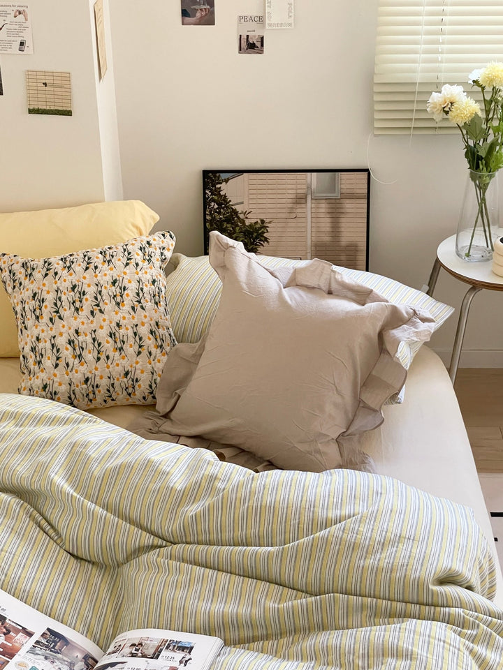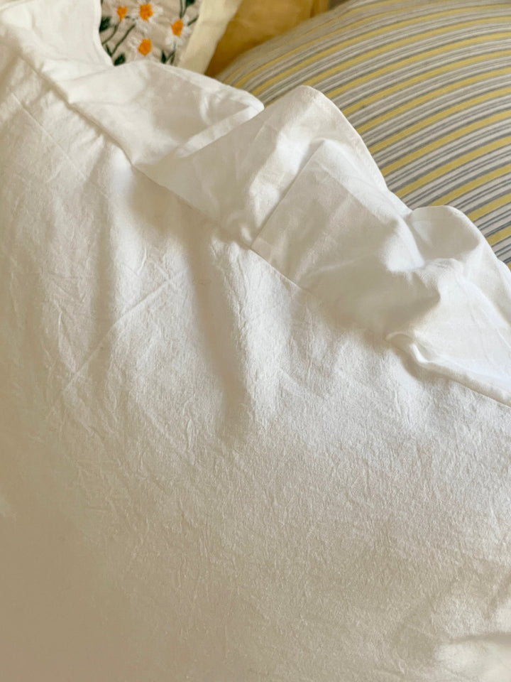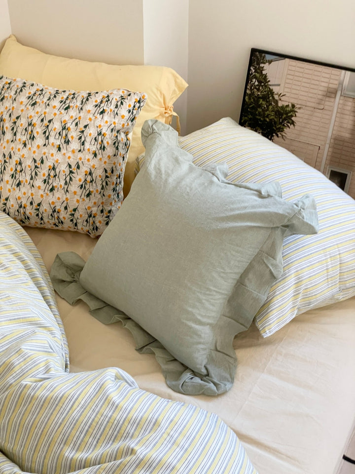 大きなフリルがついて、お部屋のワンポイントにぴったりなクッションカバーです。