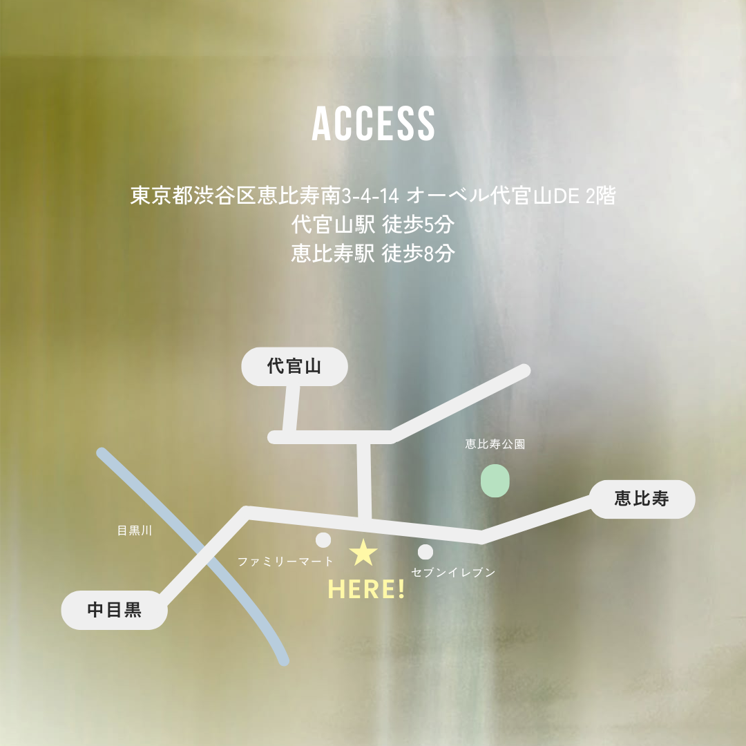 ・場所:東京都渋谷区恵比寿南3-4-14 オーベル代官山DE 2階
